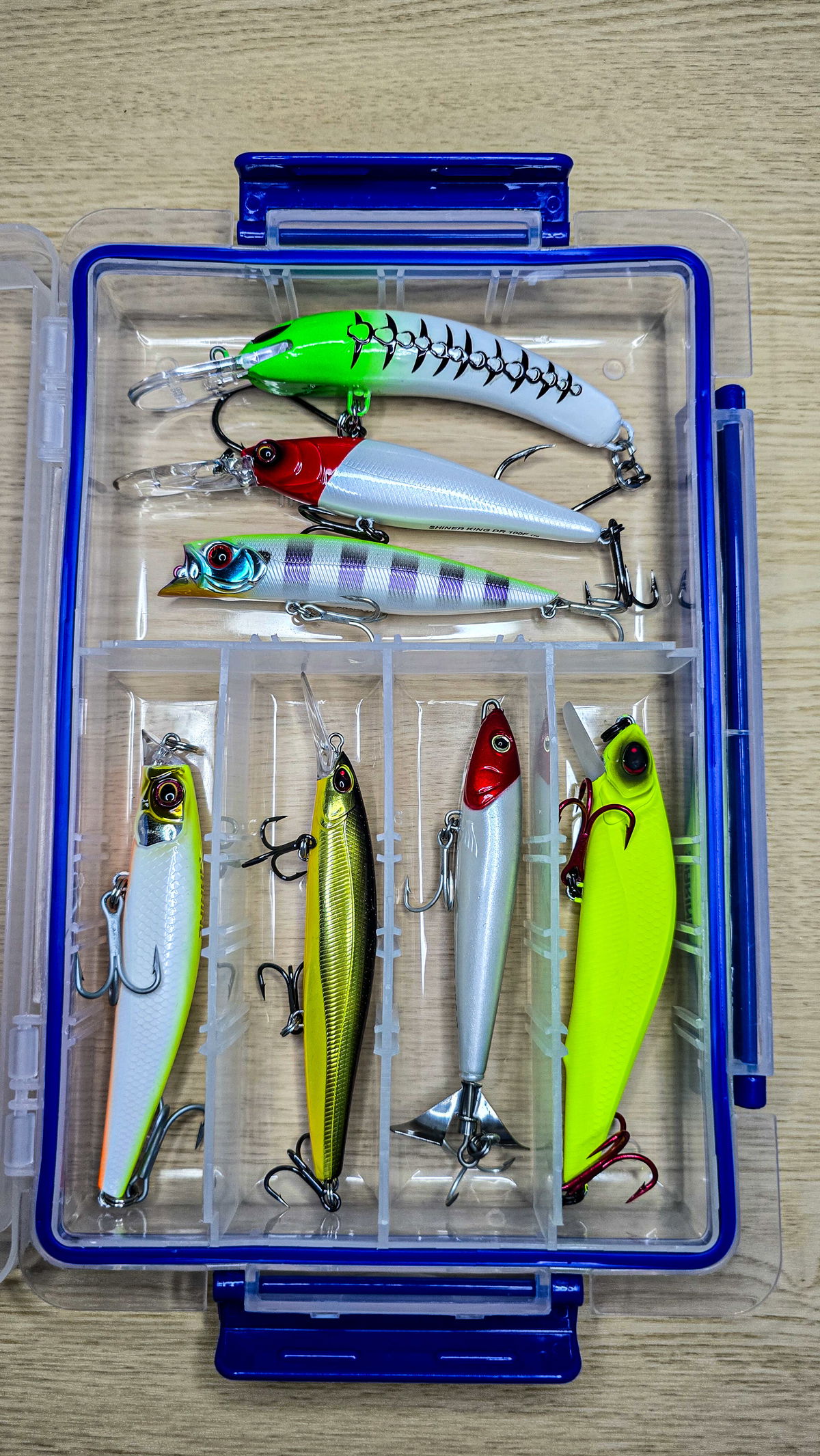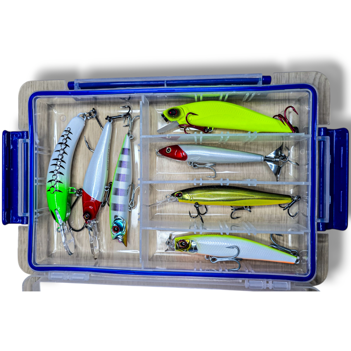 Combo ideal para tener todo organizado y listo para salir a pescar. Incluye una práctica caja Marine MS315 (18 x 27.5 x 4.3 cm) junto a una selección de señuelos efectivos para distintas profundidades y situaciones.