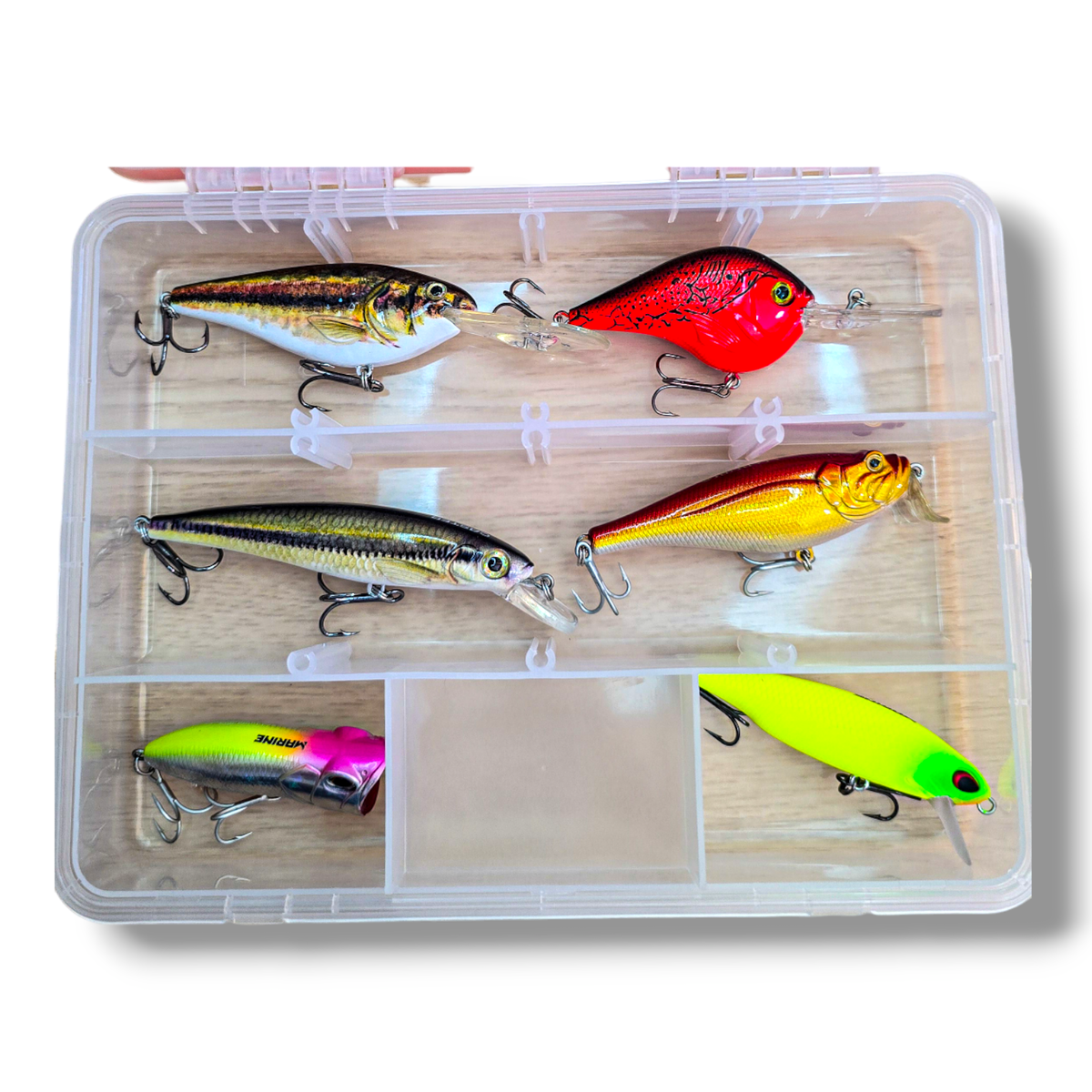 Combo ideal para cubrir todas las capas del agua en una sola salida. Incluye una práctica caja organizadora Zest 230 (23 x 17.5 x 5 cm) junto a una selección de señuelos de superficie, media agua y profundidad.