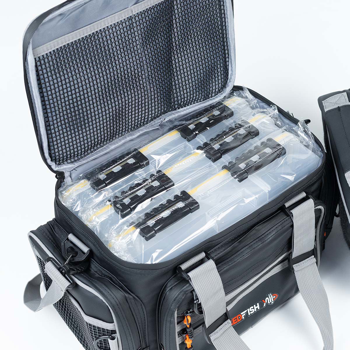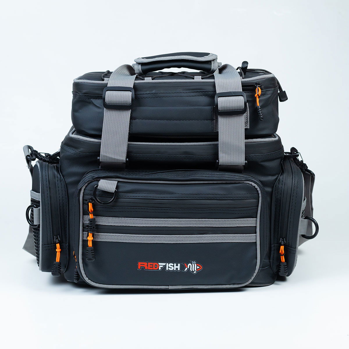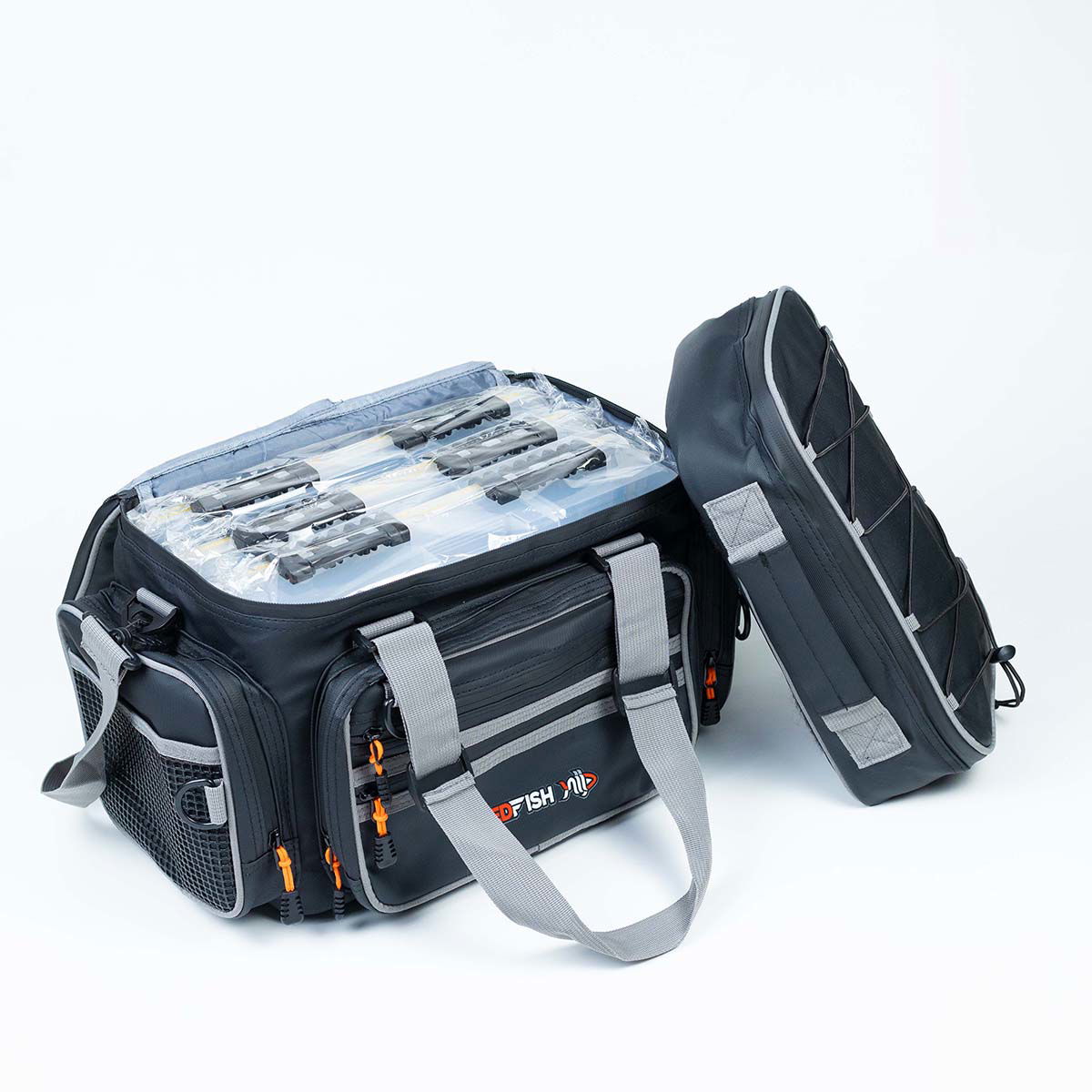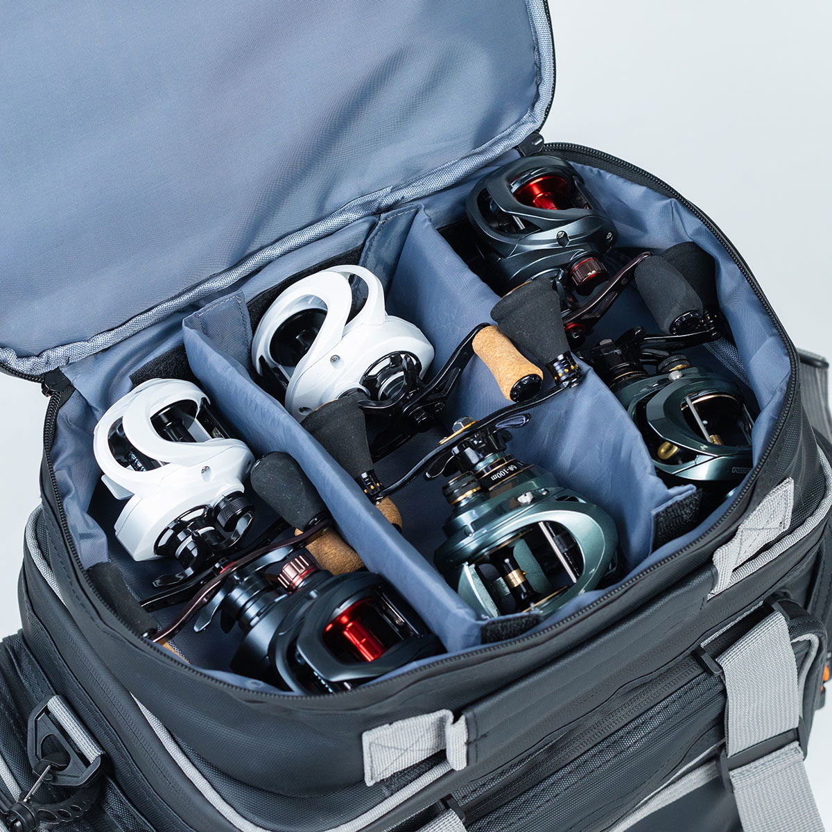 Bolso de pesca color negro. Capacidad: 1 caja doble 3650 y 2 cajas simples 3650. Compartimento superior para 6 reeles. No incluye las cajas. Dimensiones: 47 cm de ancho x 26 cm de alto x 33 cm de profundidad.