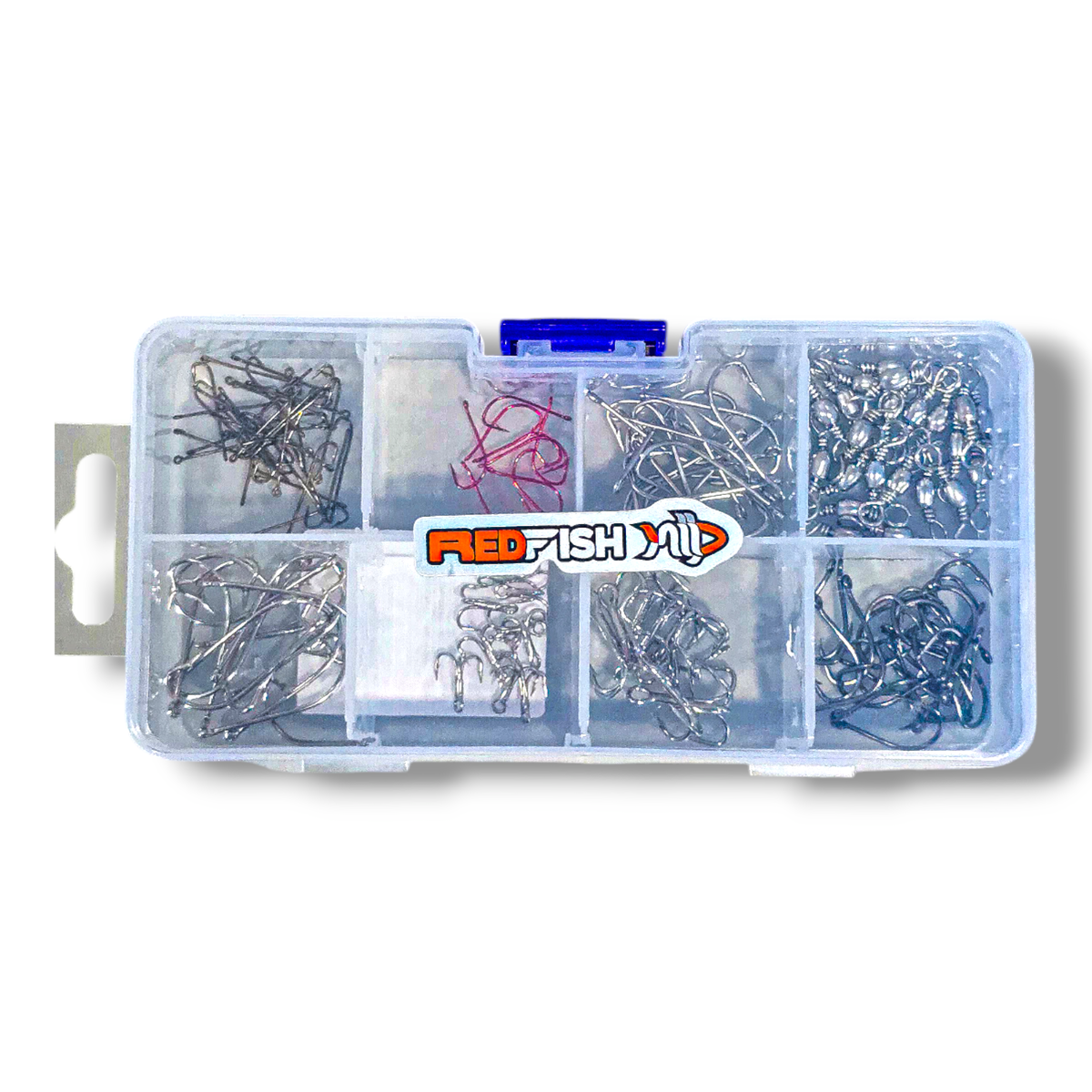 Caja completa y versátil, ideal para pescadores que buscan cubrir varias especies con un solo kit. Incluye anzuelos simples, triples y mojarreros de marcas reconocidas, más esmerillones resistentes para un armado confiable en cada jornada de pesca.