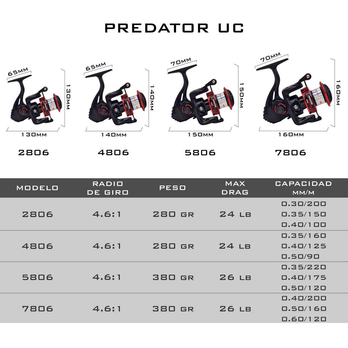 Tipo de caña utilizable: Spinning (combo ideal con la caña Caster Predator 2.10m)